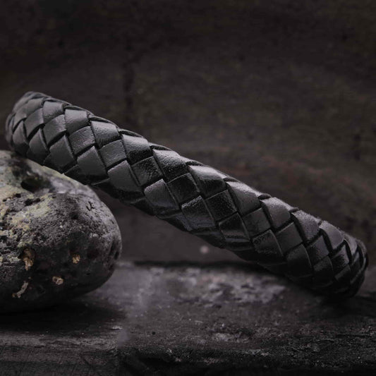 PULSERA DE CUERO TRENZADO NEGRO Y ACERO
