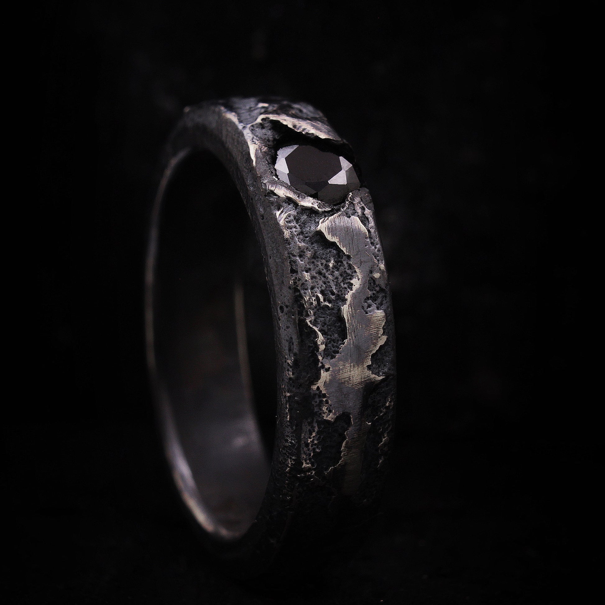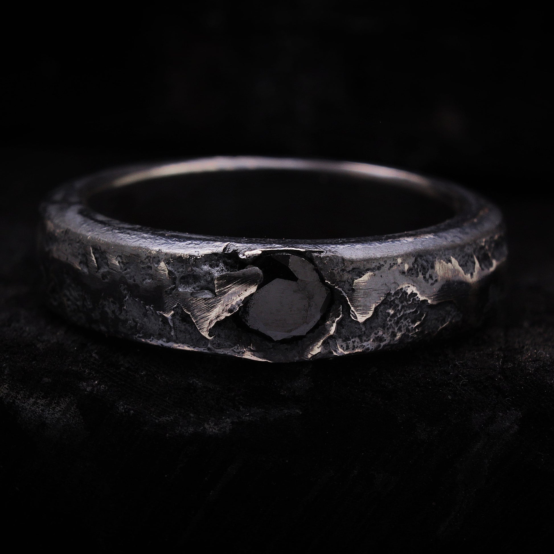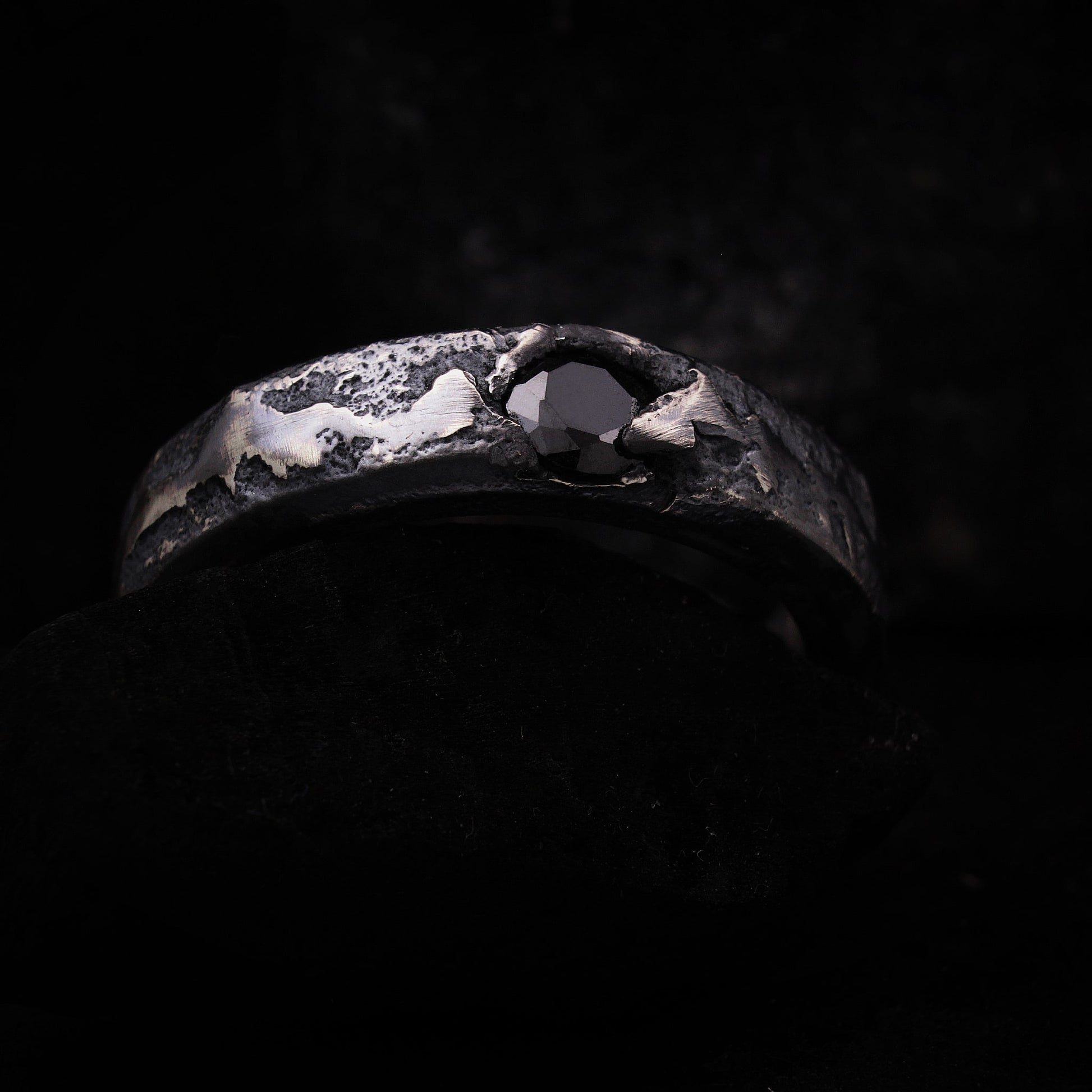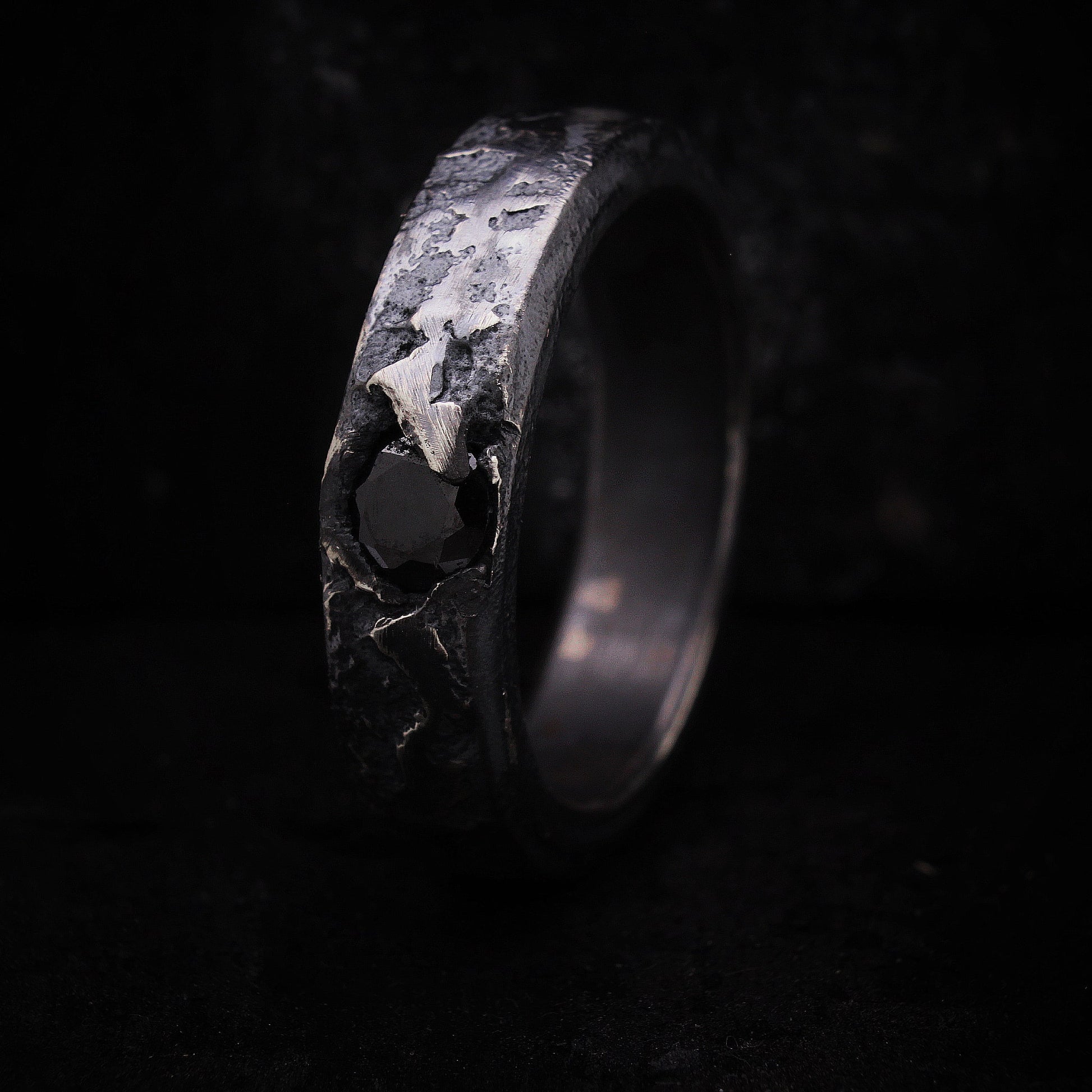 Anillo con circonita negra de plata de ley y acabado irregular.