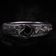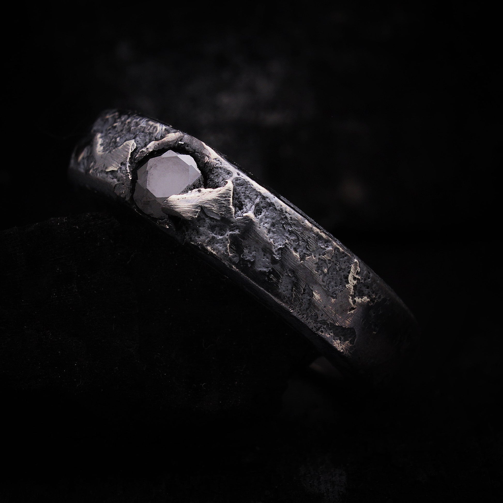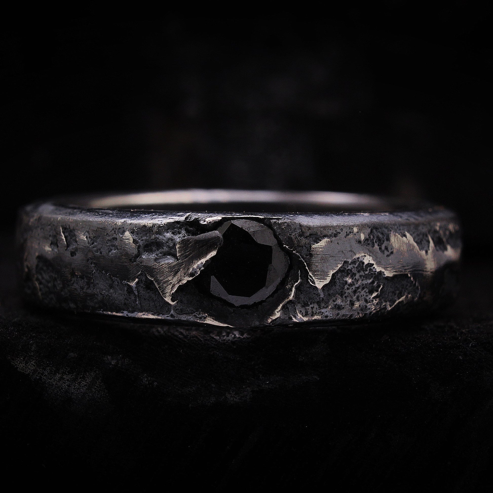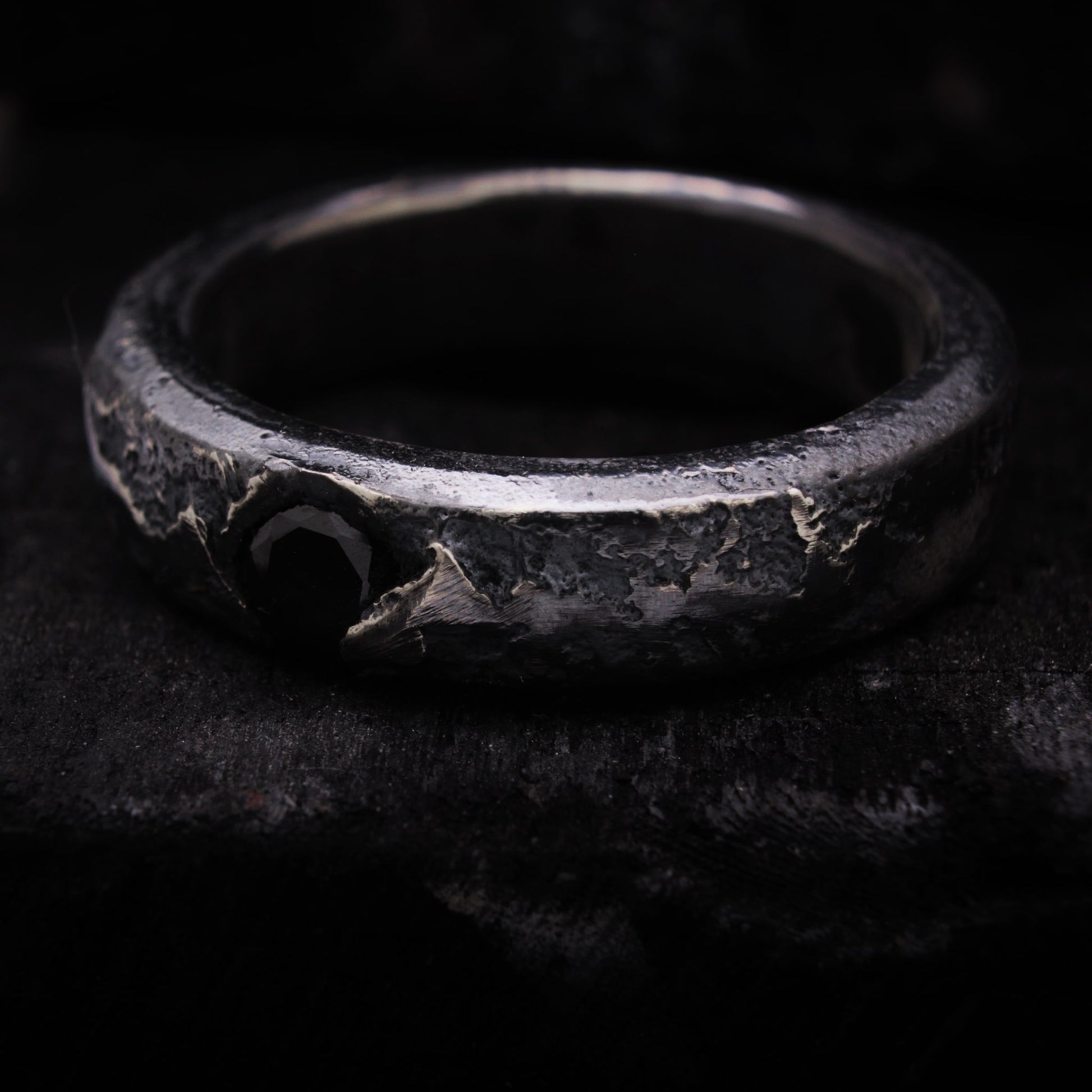 Anillo con circonita negra de plata de ley y acabado irregular.