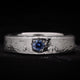 Anillo con circonita azul de plata de ley. Forjado en arena, lo que le da una textura única, y la circonita queda engarzada de forma irregular. Este anillo artesanal es robusto,