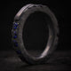 Sobre la base de Plata de Ley 925 con acabado oxidado y textura de roca, hemos incrustado una línea de Espinelas Azules Lab Grown. El azul eléctrico corta la oscuridad de la plata, creando un contraste moderno y viril. La banda incluye una sección trasera pulida y lisa, un detalle técnico que rompe la estética rústica y mejora el confort.