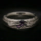 Anillo de plata hombre con diseño único, forjado en arena para conseguir una textura rústica irrepetible. Esta pieza de joyería masculina combina la robustez de la plata de ley maciza con el brillo sutil de una circonita morada.